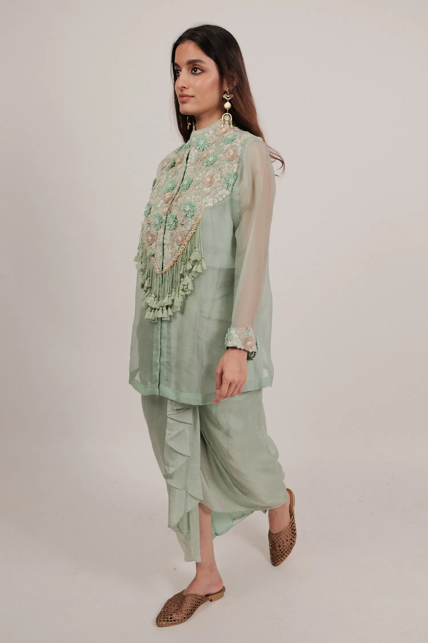 -70%Light Pista Green Organza Thread Embroidery Beaded and Dangling Fringe Tassle Top with Pleated Skirt—